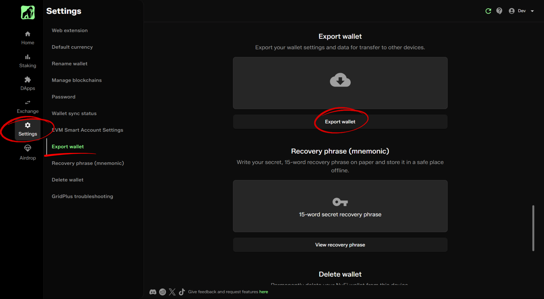 - Go to the 'Export wallet' section