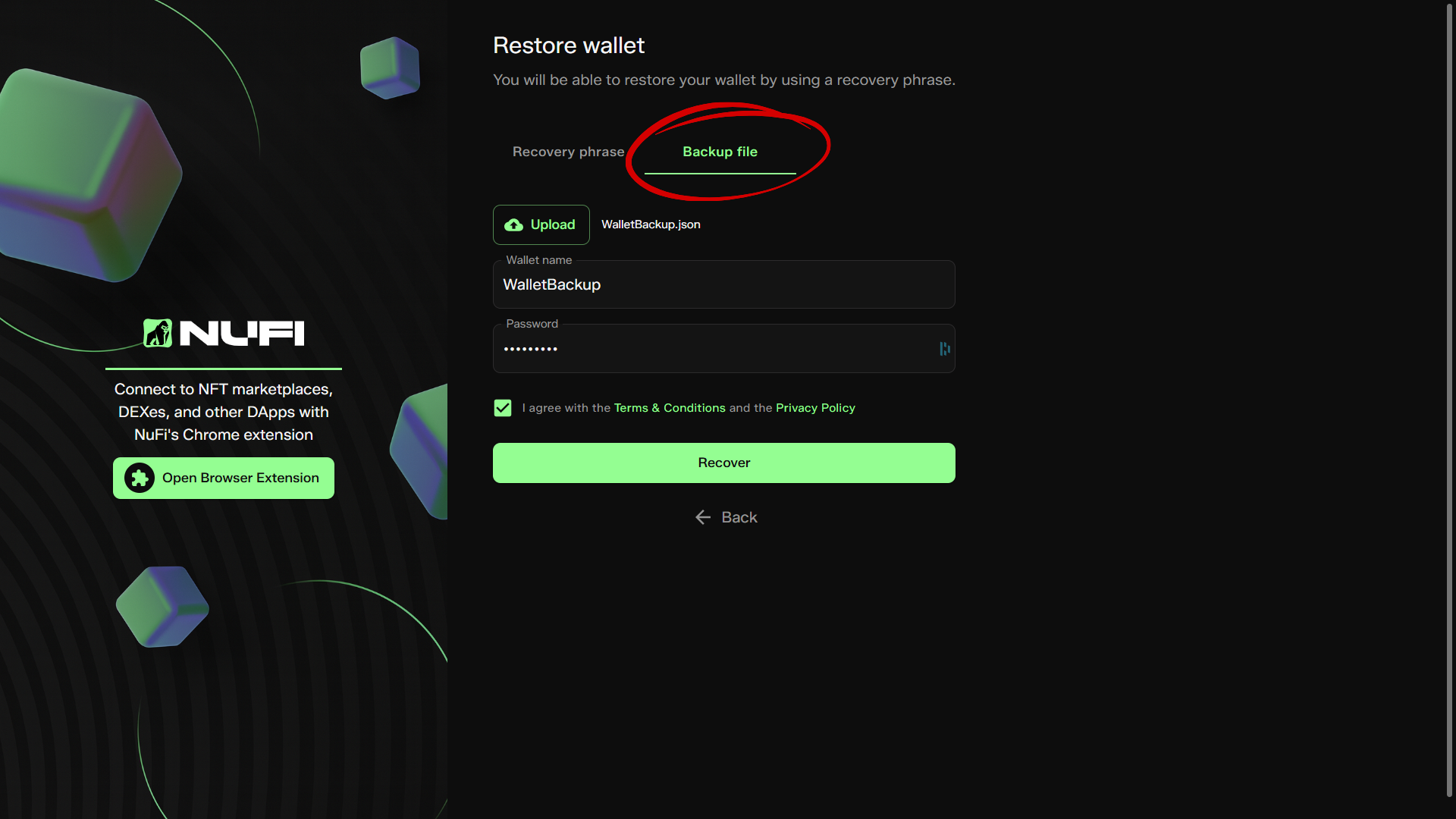 There are two ways to back up your NUFI wallet: a recovery phrase and a wallet backup file.